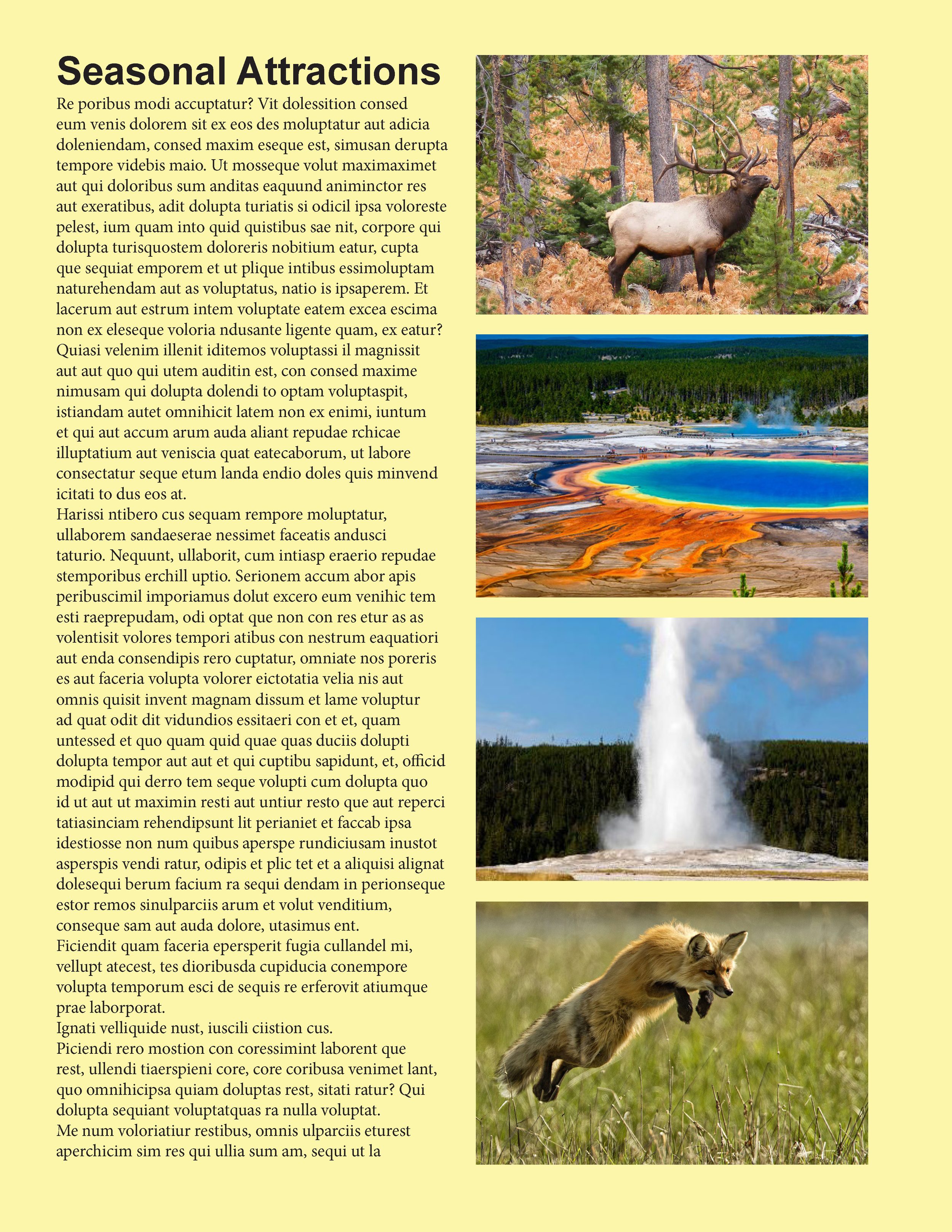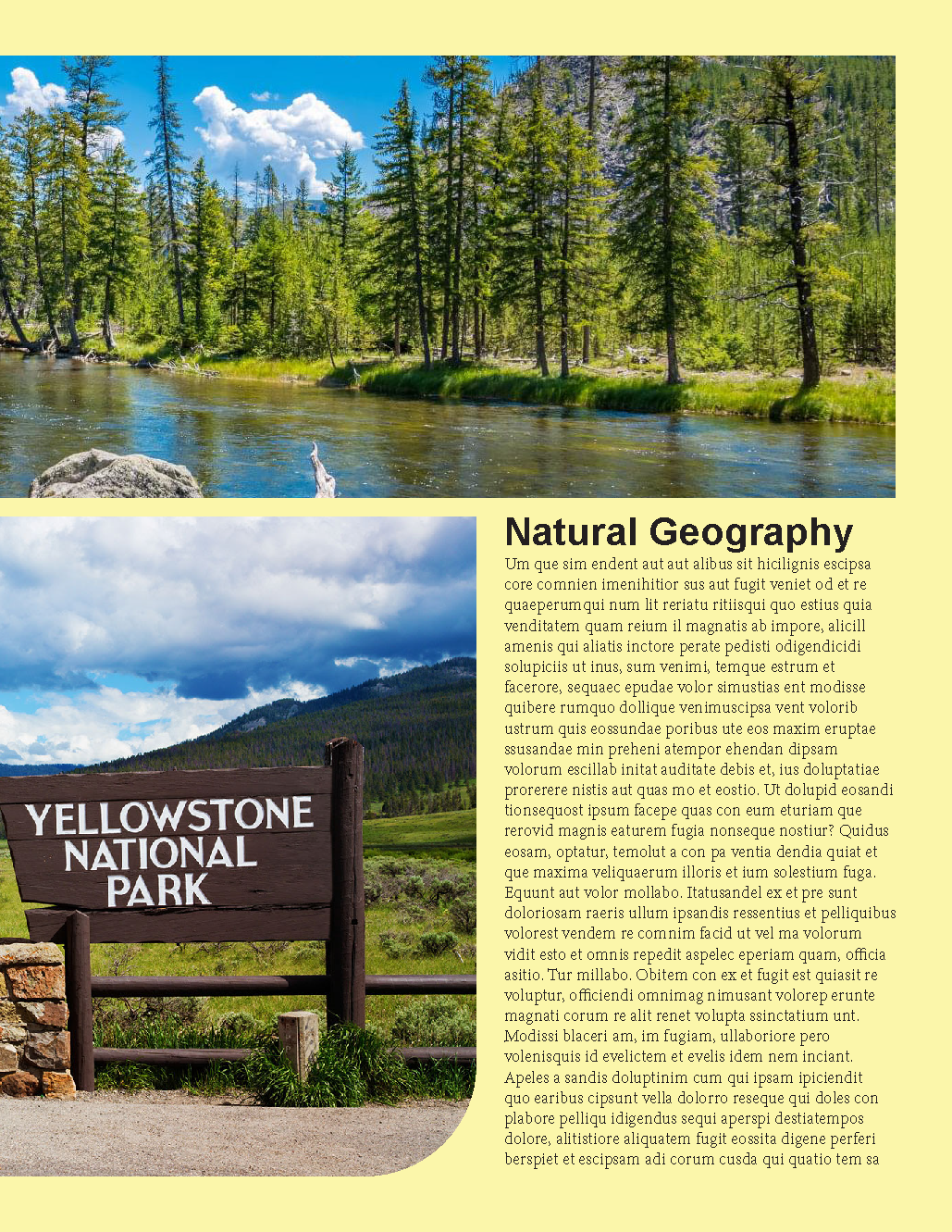 I wanted to add a few instances of rounded images and curved corners to a few images to add movement to the layout, while including plenty of images of the natural grandure of the park. From the sprawling forests and mountains, to the iconic geysers and hot springs of the park’s central calderafor which Yellowstone is most famously known. Plenty of pictures of wildlife as well add even more to the majesty of the park, enticing the reader of the sights ahead.